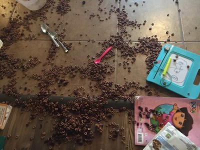 Today, I was a cleaning machine. I smiled proudly as I surveyed my accomplishment. Despite not feeling well, I had managed to clean the house and do a couple loads of laundry. Capitalizing on this new burst of energy, I decided to clean the bathroom (refer to the Vaseline incident). The girls were finally getting along and playing very well together. I gave them some books and a couple of toys to keep them occupied and immersed myself in cleaning the bathroom. Everything was good…too good. The house was quiet… too quiet. I snapped back to reality when I heard big sister yell “stop!” As I ran to the Livingroom I felt crunching under my feet, but I ignored it. As I entered the room, I was greeted by a sea of chocolate cheerios and Craisins wonderland. Every inch was covered with their concoction. They both realized I was standing there and proudly displayed their masterpiece. I faintly whispered “why?” With an innocent doe-eyed look, my oldest answered “We were hungry.” For the record, they had just finished eating lunch, so they were not hungry. Big Z knew they were in trouble, the implication of their action had not dawned on Little Z. “Look, mama!”